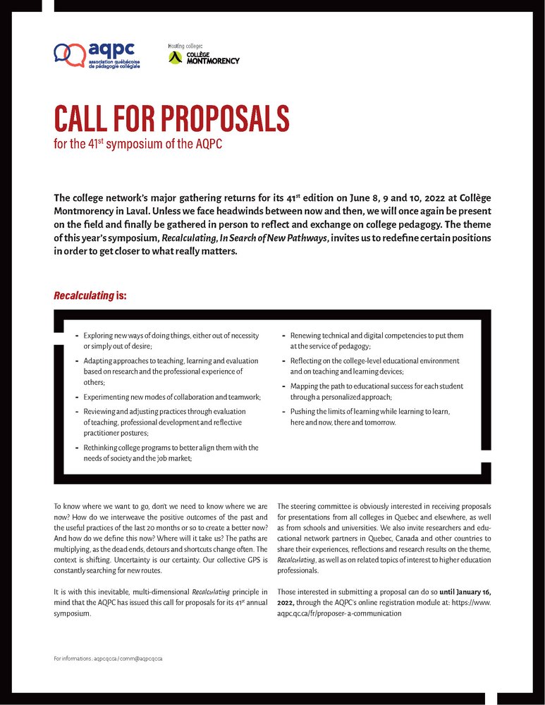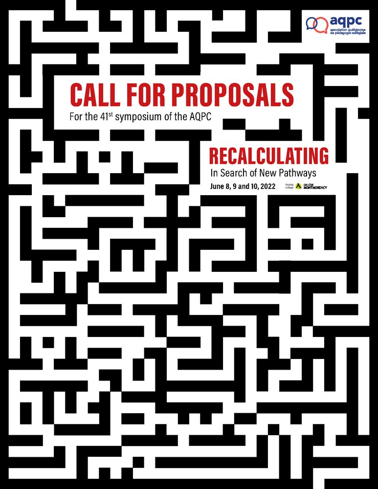 Conferences A call for proposals for the 41st Symposium of the AQPC entitled Recalculating, In Search of New Pathways, to be held on June 8, 9 and 10, 2022 at Collège Montmorency in Laval.