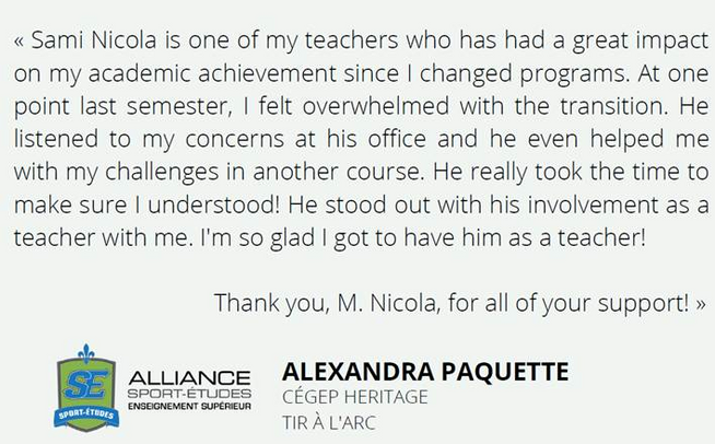 In 2022 under 25 teachers were recognized in the province of Quebec, one of which was Mr. Sami Nicola from our EIT program. The Alliance Sport-Études selection committee named him a precious collaborator in the academic and athletic success of student-athletes.