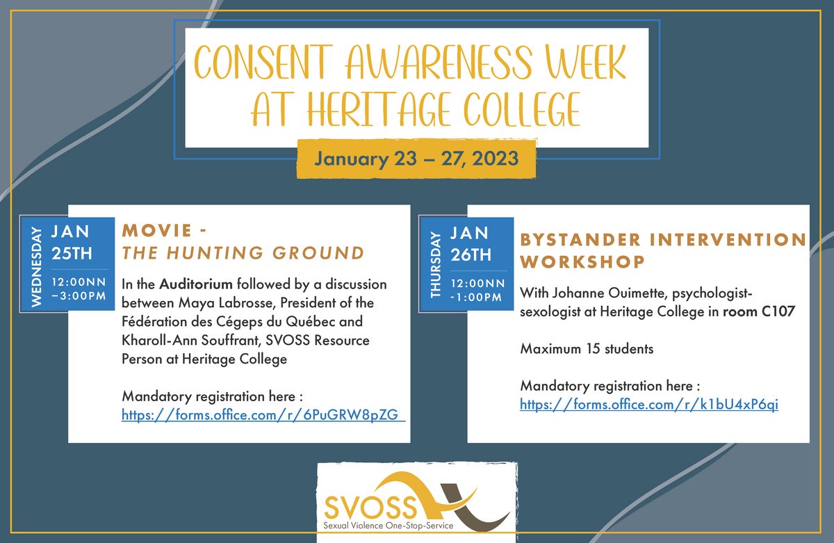 Le guichet unique en matière de violence sexuelle du Cégep Heritage College s’engage à offrir un environnement où les membres de la communauté du Collège peuvent étudier et travailler dans un environnement exempt de violence sexuelle. Nous croyons qu’il est important de traiter la violence sexuelle avec le sérieux qu’elle mérite, de reconnaître le traumatisme causé par la violence sexuelle et d’encourager les efforts des personnes à obtenir de l’aide et à recevoir les services appropriés.