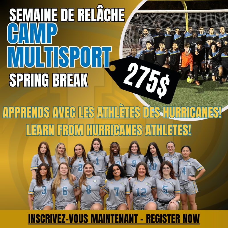 Ce camp multisport offre aux enfants l'occasion de passer leurs journées à jouer au soccer, flag-football, basketball, volleyball et plus encore. Ils auront également la chance de côtoyer les étudiant-athlètes inter-collégiaux des Hurricanes du Cégep Heritage.