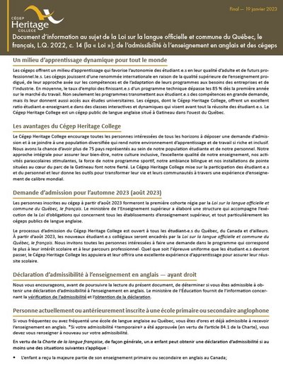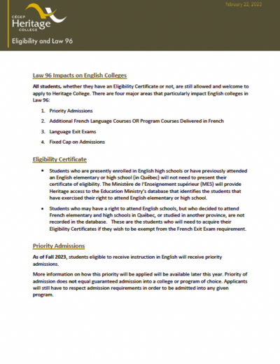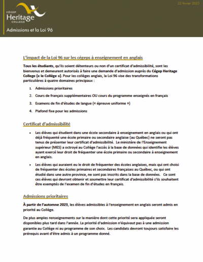 Tous les étudiants, qu'ils soient détenteurs ou non d’un certificat d'admissibilité, sont les bienvenus et demeurent autorisés à faire une demande d’admission auprès du Cégep Heritage College (« le Collège »). Pour les collèges anglais, la Loi 96 vise des transformations particulières à quatre domaines principaux :