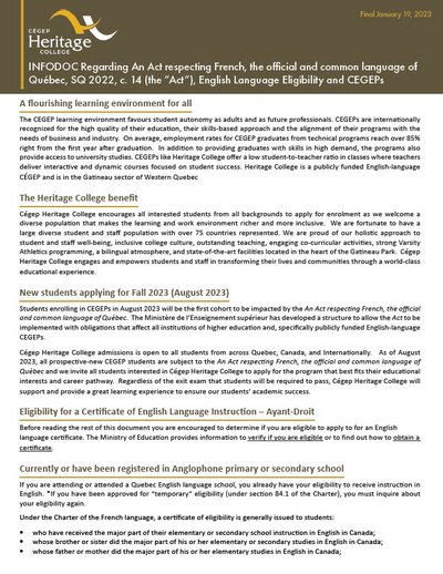 Nous invitons toutes les personnes qui souhaitent étudier au Cégep Heritage College à bien s’informer des conséquences de la Loi et à demander une déclaration d’admissibilité à l’enseignement en anglais. Idéalement, la demande devrait être présentée de trois (3) à quatre (4) mois avant l’obtention du diplôme d’études secondaires (le ministère a besoin d’un certain temps pour traiter toutes les demandes).
