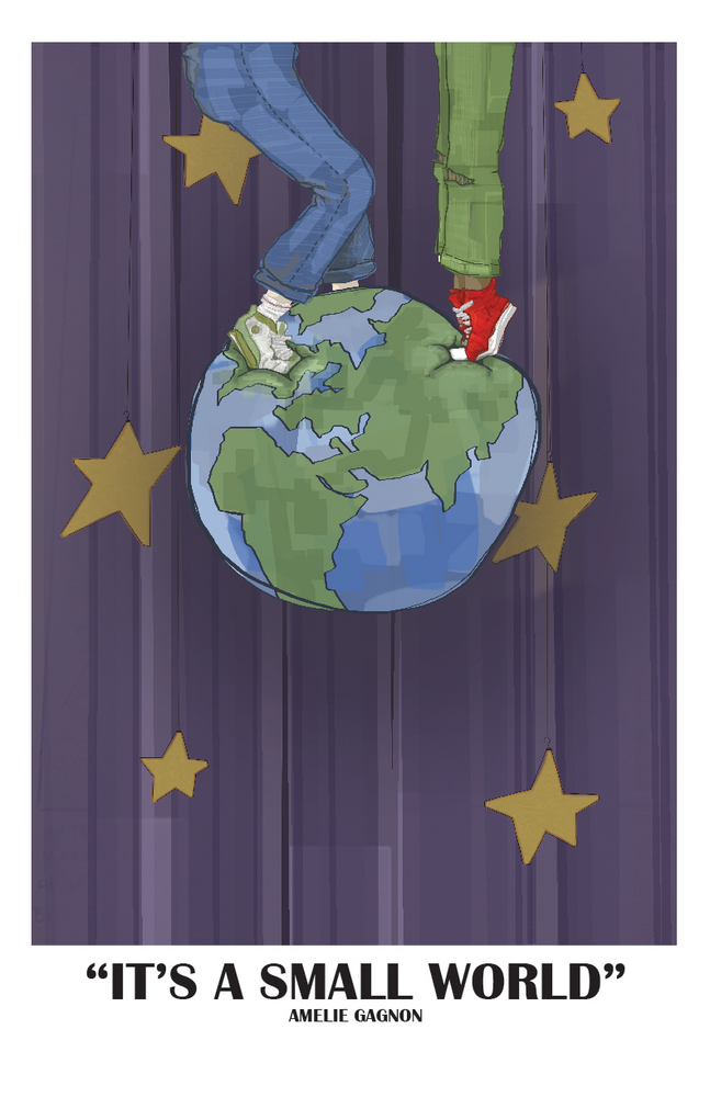 Description: Cette illustration est mon interprétation de l’expression populaire « le monde est petit ». L’illustration représente deux personnes qui se rencontrent dans un petit monde entouré d’étoiles suspendues et d’un arrière-plan drapé. J’ai utilisé Photoshop pour créer les multiples couches de la composition. En utilisant différents pinceaux, de tailles et de textures variées, j’ai pu obtenir ce style gestuel au marqueur à alcool qui, à mon avis, s’accorde bien avec la nature ludique de cette œuvre.