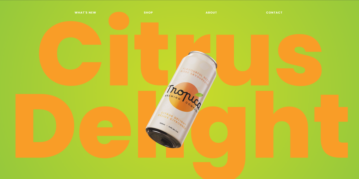Un site web attrayant créé pour la Tropica Brewing Company, présentant les différentes saveurs du produit, les modes d’achat, des informations sur l’entreprise et la façon de la contacter.