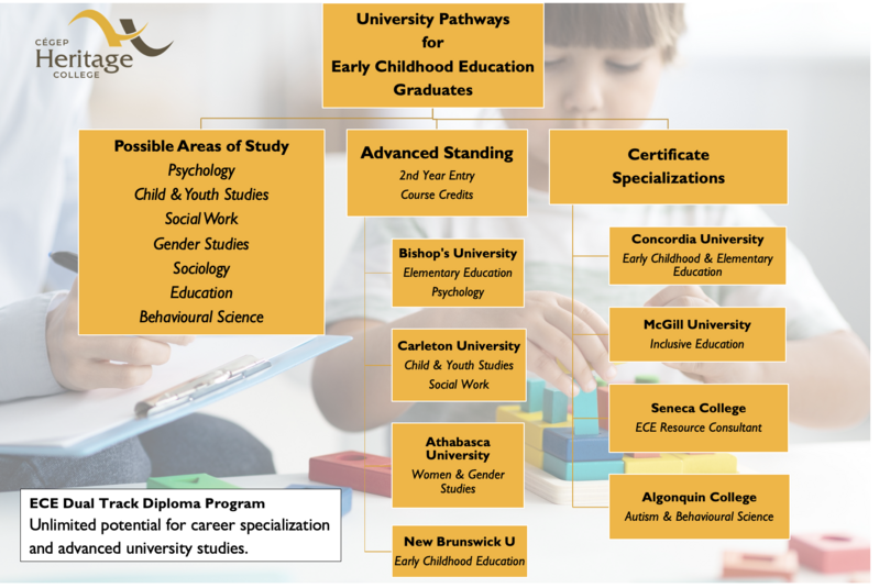 Cégep Heritage College ECE graduates enjoy the option of continuing their studies at the university level. Postgraduate areas of study may include Psychology, Child and Youth Studies, Social Work, Gender Studies, and Education. ECE Graduates may receive advanced standing and/or course credits at many Canadian universities, enabling them to complete a bachelor's degree in a shorter timeframe.