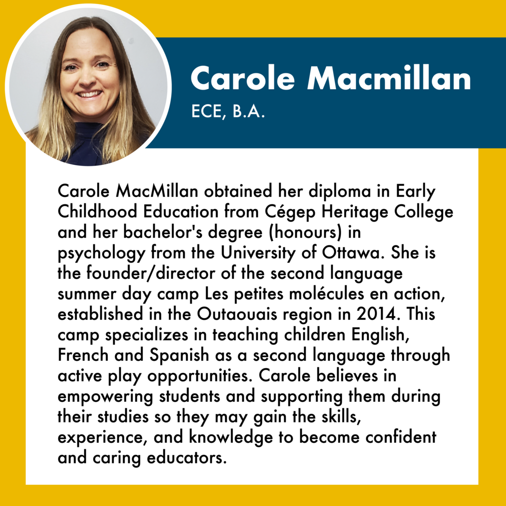 I remember my time at CÉGEP Heritage College with fondness and warmth. The Early Childhood Education faculty is comprised of knowledgeable, responsive, and inspirational leaders, which resulted in continuous support throughout my journey in Early Childhood Education. With their guidance and expertise, I developed the confidence, insight and skills set to become a strong educator and advocate for children. After graduation, I was inspired to pursue further studies in child development and education: I earned a Bachelor of Arts degree in Child Studies from Carleton University and a Master of Education in Studies of Teaching and Learning from the University of Ottawa. My Heritage experience allowed me to connect with a strong community of educational professionals; I had the opportunity to sit on College’s Board of Governors, I had the pleasure of supervising early childhood students on placement with Algonquin College and CÉGEP Heritage College, as well as teaching in the latter’s Continuing Education department! The doors that I open challenge my grit as a lifelong learner, and I am grateful to Heritage and the Early Childhood Education faculty for their continued support (even to this day!) in my endeavours.