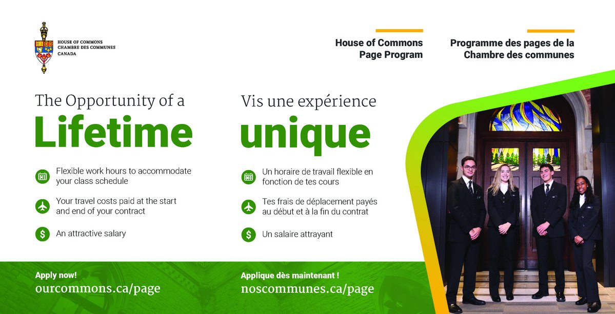 Starting post-secondary studies next year? Speak both official languages? Want to spend an incredible year on Parliament Hill and make friendships that will last a lifetime? Become a House of Commons Page! The recruitment campaign for the 2022-2023 academic year is on NOW. The deadline to submit your application is November 7, 2021.